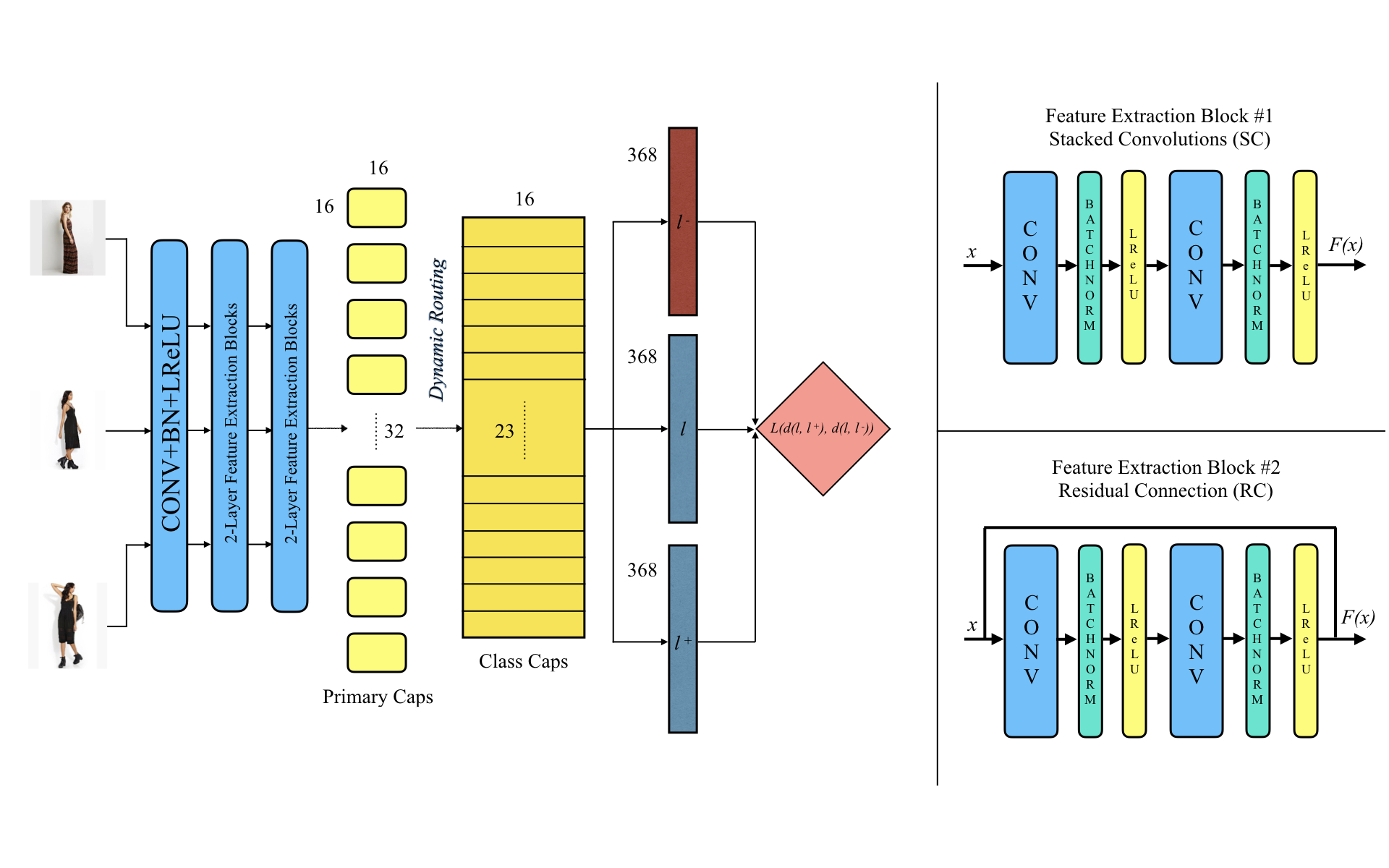 In this study, we investigate in-shop clothing retrieval performance of densely-connected Capsule Networks with dynamic routing. To achieve this, we propose Triplet-based design of Capsule Network architecture with two differ- ent feature extraction methods. In our design, Stacked- convolutional (SC) and Residual-connected (RC) blocks are used to form the input of capsule layers. Experimental re- sults show that both of our designs outperform all variants of the baseline study, namely FashionNet, without relying on the landmark information. Moreover, when compared to the SOTA architectures on clothing retrieval, our proposed Triplet Capsule Networks achieve comparable recall rates only with half of parameters used in the SOTA architectures.